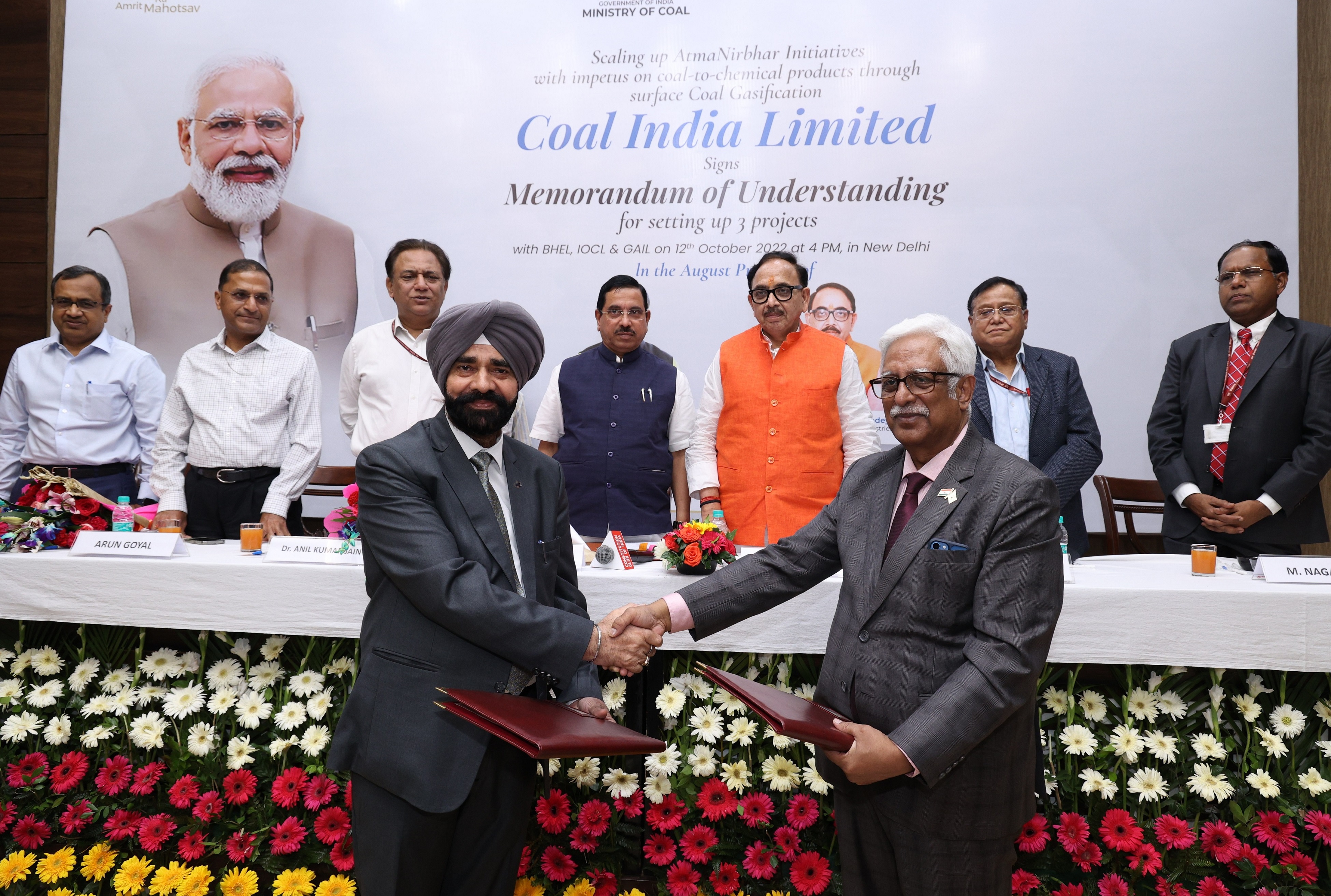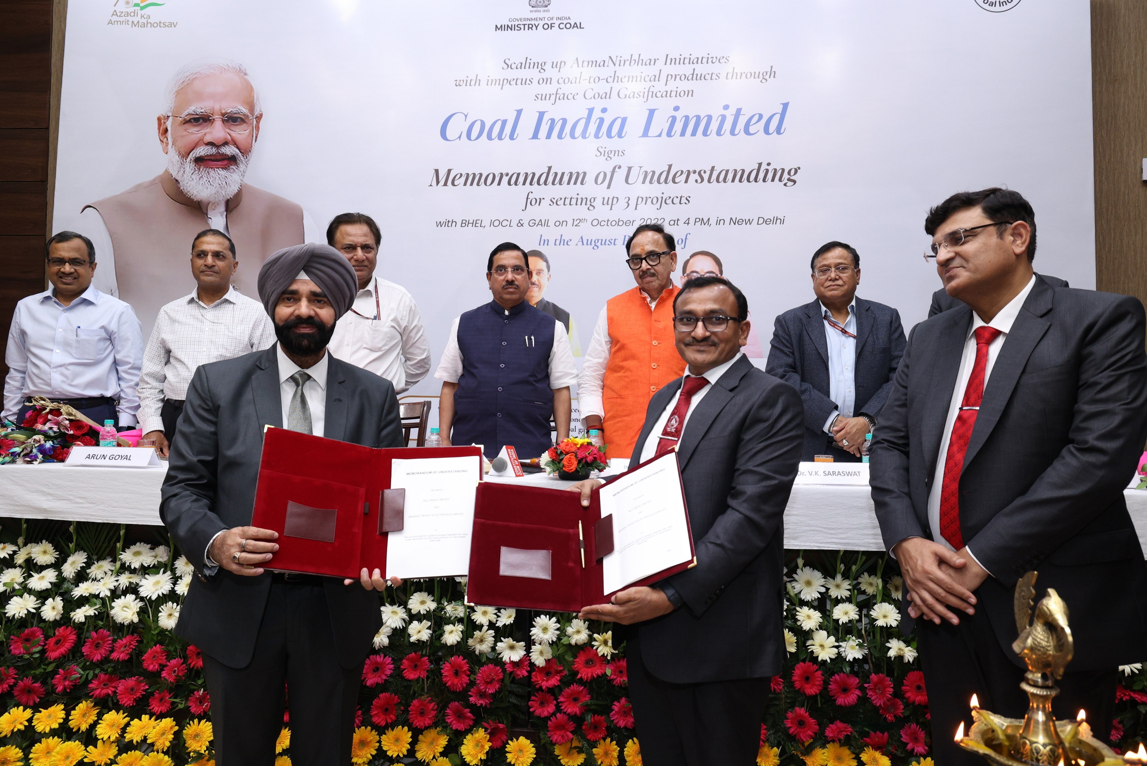 New Delhi, October 12: Aimed at gainfully utilising the country’s vast reserves of coal & lignite, Bharat Heavy Electricals Limited (BHEL) has entered into strategic MoUs with Coal India Limited (CIL) and NLC India Limited (NLCIL) for setting up Coal Gasification based plants. Under these MoUs, BHEL will jointly set up a Coal to Ammonium Nitrate Project with CIL based on gasification of high ash Indian coal, and a lignite-based gasification pilot plant with NLCIL for power generation, utilising BHEL’s indigenously-developed Pressurised Fluidised Bed Gasification (PFBG) technology. Significantly, this will be a breakthrough step towards meeting the National Coal Gasification Mission target of 100 Million MT.