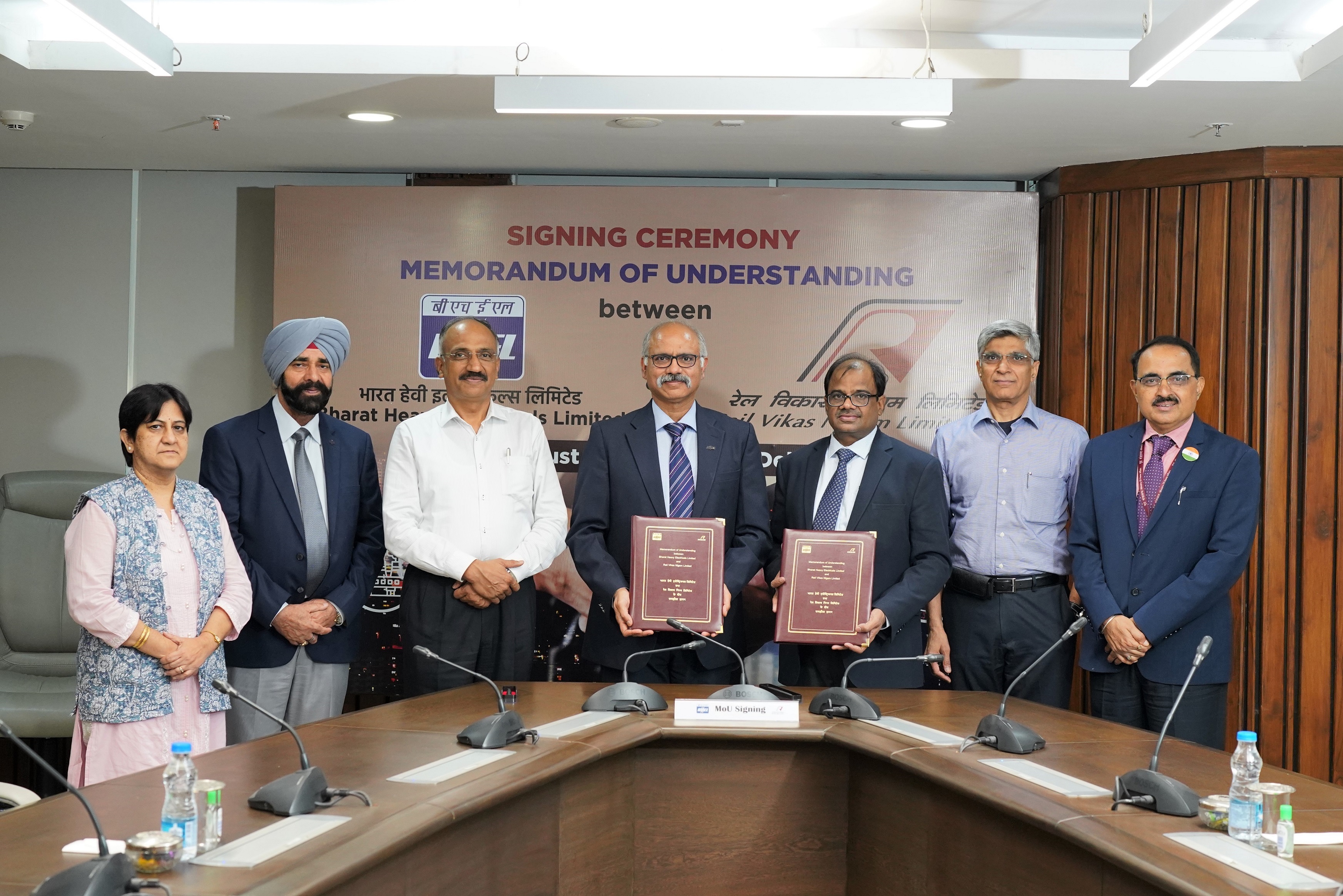 New Delhi, August 26: BHEL and Rail Vikas Nigam Ltd. (RVNL) have signed an MoU to jointly work in the field of infrastructure and project execution, in India and abroad, through synergy of their respective capabilities. This will pave the way for collaboration in both the present as well as future areas of operation towards the 'Atmanirbhar Bharat Abhiyan' of the Government of India.