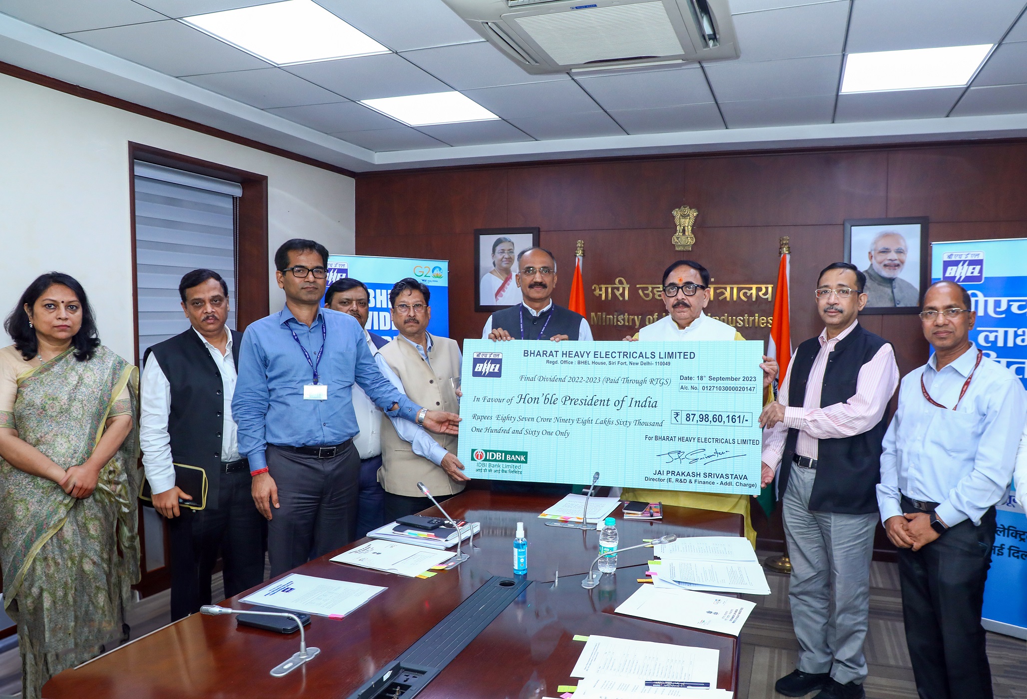 डॉ. नलिन सिंघल, अध्यक्ष एवं प्रबंध निदेशक, बीएचईएल ने श्री कमरान रिजवी, सचिव, भारी उद्योग की उपस्थिति में भारत सरकार द्वारा धारित इक्विटी (63.17%) पर वर्ष 2022-23 के अंतिम लाभांश का चेक माननीय केंद्रीय भारी उद्योग मंत्री, डॉ. महेंद्र नाथ पाण्डेय को भेंट किया।